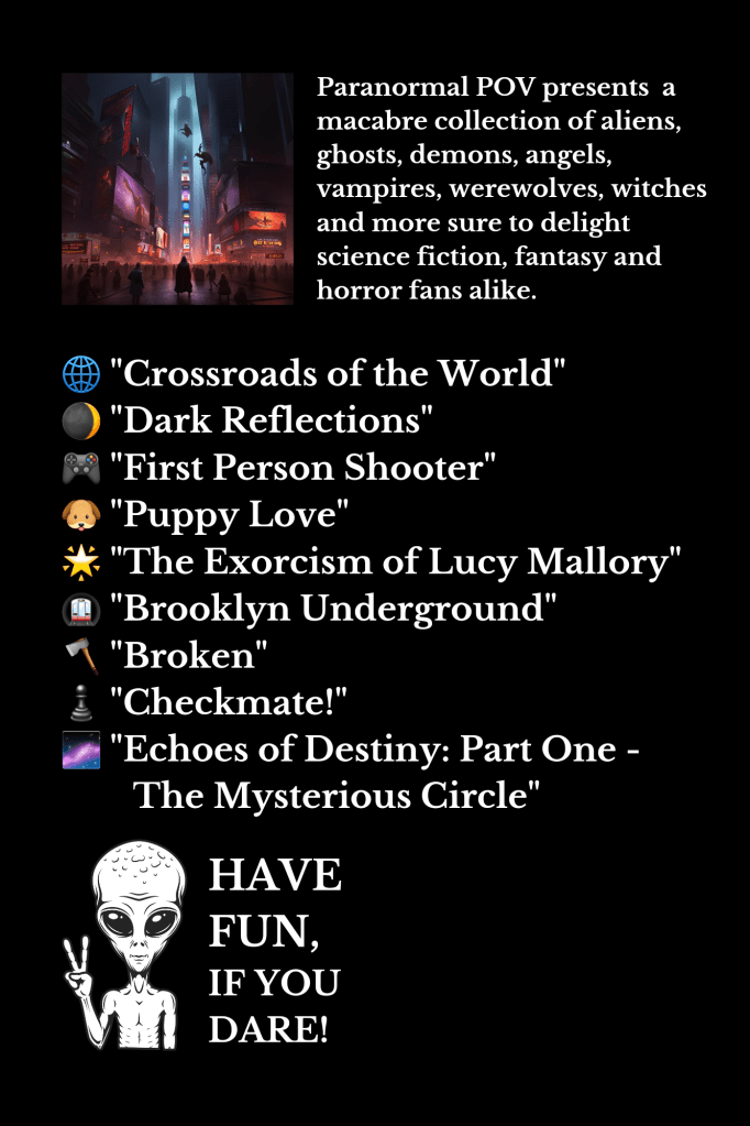 Prepare to be entranced by “Paranormal POV presents: Aliens, Witches, & Ghosts, Oh My!” – an enchanting compilation of short stories that will transport you to the captivating crossroads of the supernatural and the unknown. Dive into a realm where the ordinary collides head-on with the extraordinary, and where the unexplained transforms into the thrillingly suspenseful action and adventure.