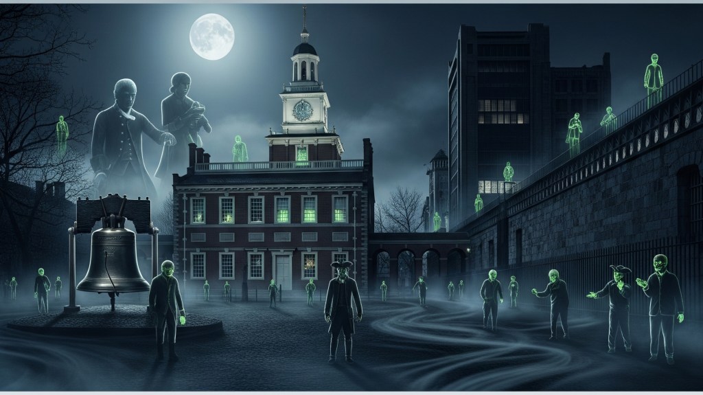 As colonial history took root, the violent and traumatic events of America’s early conflicts imprinted themselves on the landscape, giving rise to many of the region’s most famous ghost stories. Philadelphia, in particular, served as a nexus of Revolutionary-era history and subsequent paranormal activity. The spirits of the Founding Fathers are said to linger in the city’s most historic sites, with the ghost of Benjamin Franklin reportedly roaming Independence Hall and Christ Church Burial Ground, perhaps keeping watch over the nation he helped create.7 The ghost of Benedict Arnold is said to haunt Independence Hall, burdened by guilt, while Betsy Ross is believed to mourn her personal losses at the house where the first American flag was sewn.7 The Powel House, once a social hub for the colonial elite, is reportedly the site of an unending party attended by the ghosts of Peggy Shippen and shadowy Continental soldiers.11 The Brandywine Battlefield, site of the final engagement in the bloody Battle of Brandywine, is also said to be haunted by fallen soldiers buried in its mass graves.15 A specific legend recounts the ghost of General “Mad Anthony” Wayne, whose spirit is said to ride across the state on his birthday in search of his missing bones, a legend born from the grisly tale of his disinterment.15