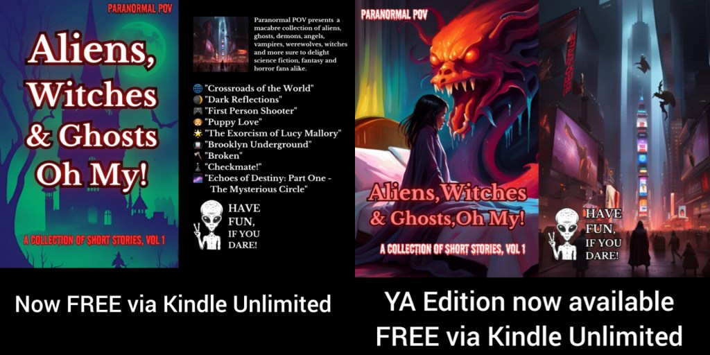 - Aliens, Witches & Ghosts, Oh My!: A Collection of Short Stories Vol. 1 (YA Edition) (Paranormal POV Book 2) YA Edition includes 8 of the 9 stories, no images, EBOOK and Paperback available.